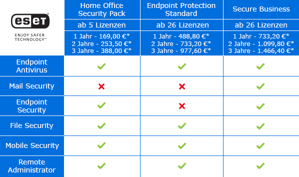 Mit ESET bieten wir Ihnen einen der leistungsfähigsten und professionellsten Virenschutzlösungen für Clients und Server. Besonders die geringe Systembelastung, starke Viren- & Trojanererkennung sowie günstige Preise zeichnen ESET aus.